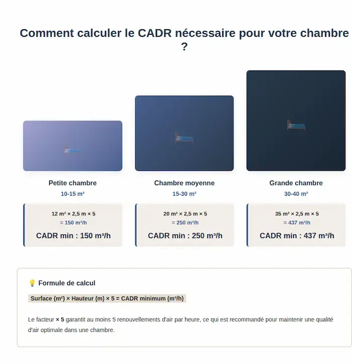 Pourquoi multiplier par 5 ? Pour garantir au moins 5 renouvellements d’air par heure, ce qui est recommandé pour maintenir une qualité d’air optimale dans une chambre.